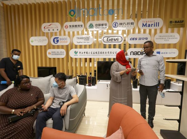 9月14日,乌干达青年企业家迪莉娅(前左)在吉布提国际自贸区跨境电商平台展示区与中方人员交流。(新华社发)