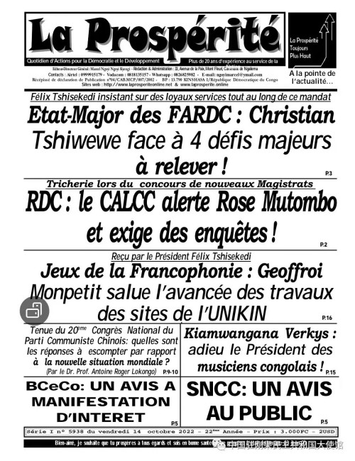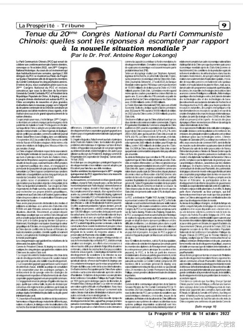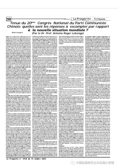 近日,刚果(金)知名学者龙刚(Dr. Prof. Antoine Roger Lokongo)在刚主流大报《繁荣报》上发表署名文章,积极评价中国共产党第二十次全国代表大会。文章主要内容如下: