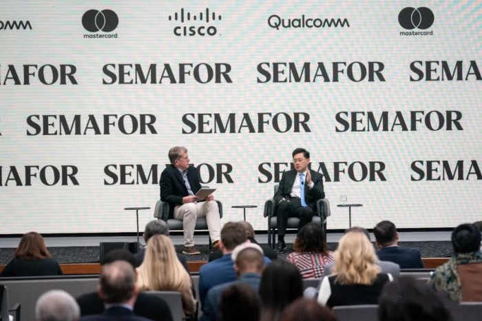 12月12日,在美国华盛顿,中国驻美大使秦刚(右)出席美国“旗语”新闻社举办的一场论坛并参加“炉边谈话”活动。新华社记者 刘杰摄