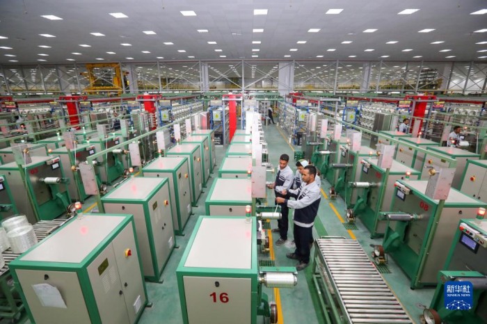 廖力强表示,近年来,中埃政治互信更加巩固,务实合作成果丰硕,相信未来将有越来越多中国企业来到埃及投资兴业,希望中埃双方携手努力,共同推动双边经贸合作取得更多成果。图为12月15日,在位于埃及苏伊士省的中国巨石埃及玻璃纤维股份有限公司(巨石埃及公司),工人在玻璃纤维生产线上工作。