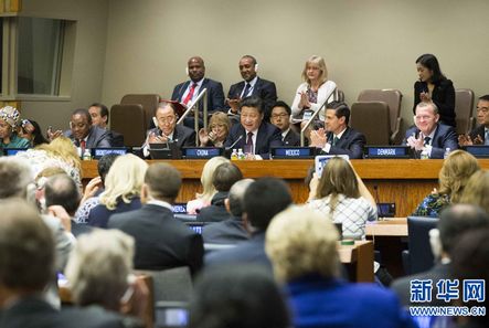 我们刚刚通过2015年后发展议程,性别视角已纳入新发展议程各个领域。让我们发扬北京世界妇女大会精神,重申承诺,为促进男女平等和妇女全面发展加速行动。