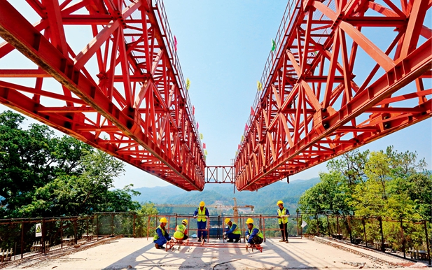 在位于云南省普洱市的木乃河双线特大桥工程现场,工人在施工作业