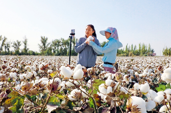 2024年9月24日,新疆生产建设兵团职工在棉花地进行电商直播