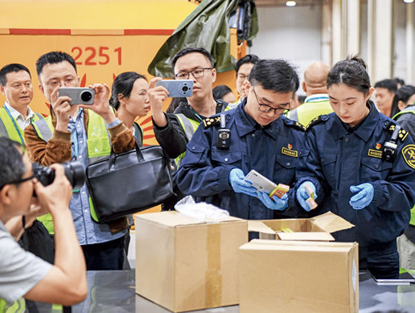 2025年12月18日,海南海口美兰机场“二线口岸”迎来海南自贸港全岛封关后第一批享受加工增值免关税政策出岛的货物。图为海关工作人员正在查验货物