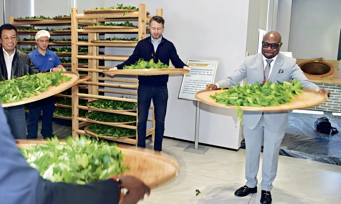 2025年11月17日,第十七届海峡两岸茶业博览会系列活动之“外交官看武夷”活动在福建武夷山举行。驻华使节参加茶博会开馆式,走访茶企,共叙茶事,体验制茶技艺,沉浸式感受茶文化的深厚底蕴。图为驻华使节体验摇青制茶技艺