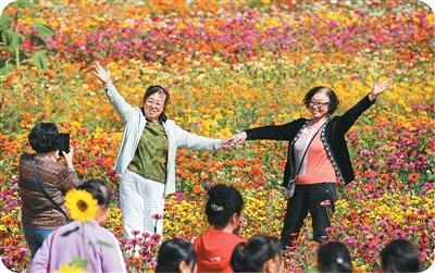 游客在云南省西双版纳傣族自治州景洪市曼沙村赏花游玩。