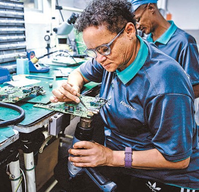 海信南非工业园电视工厂,公司招聘培养的当地工程师在检测电路板