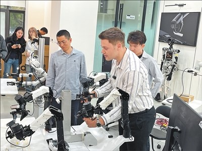 东南欧国家青年代表体验操控机械臂。本报记者 李安琪