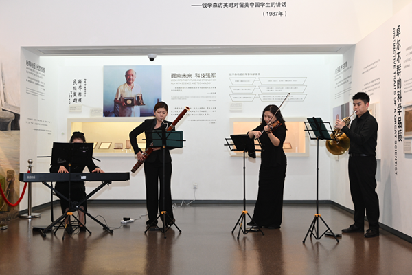 整场音乐党课被分为“序章”“第一章:两弹一星历史伟业”“第二章:中国航天事业奠基人”“第三章:科学技术前沿开拓者”“第四章:人民科学家风范”“第五章:战略科学家的成功之道”六个章节。在每个章节,观众跟随着主讲人的步伐,穿梭于钱学森图书馆的四大专题展厅。《茉莉花》《我的祖国叫中国》《东方红》《走向复兴》《红旗颂》《我的中国心》……漫步在展厅之中,聆听着钱学森图书馆主讲人口中一个个鲜活动人的故事,配合着上海音乐学院和上海交响乐团的音乐家们现场演奏的一首首动人乐曲,观众们在视觉和听觉全方位的“沉浸式”课堂里身临其境,仿佛被带领着重温了“人民科学家”钱学森为祖国之崛起、民族之复兴而不懈追求的百年追梦人生。