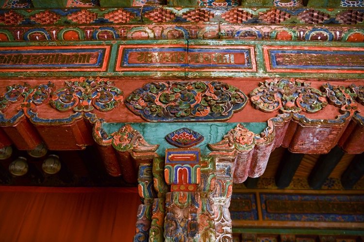 殿内雕花则融合了汉族卷草纹与藏式莲花纹
