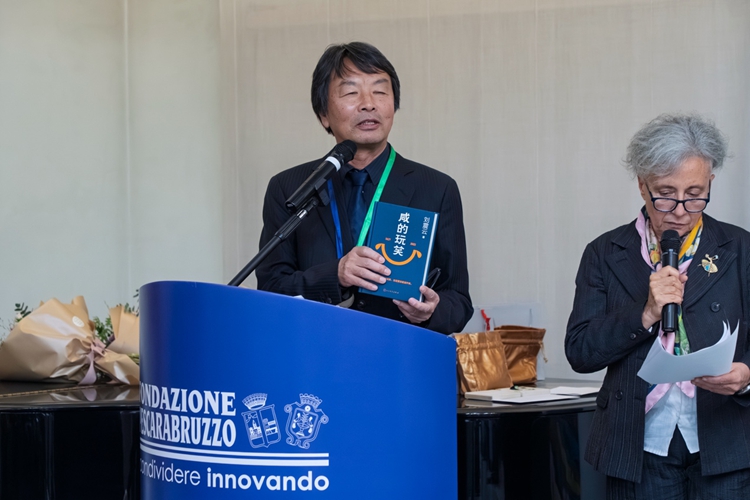 2026年2月20日,刘震云在意大利国际南北文学奖的颁奖仪式上讲话,旁边为其作品意大利语翻译李莎(Patrizia Liberati)