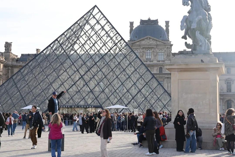 2025年10月22日,在法国巴黎,大量游客聚集在卢浮宫博物馆的玻璃金字塔入口前 新华社记者 张百慧 摄