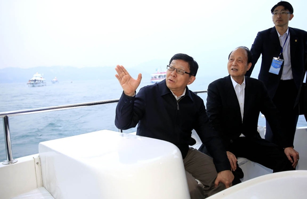 2015年12月5日,海峡两岸关系协会会长陈德铭(左一)在台湾海峡交流基金会董事长林中森的陪同下,乘船参访日月潭