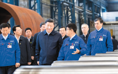 2018年9月25-28日,中共中央总书记、国家主席、中央军委主席习近平在东北三省考察,主持召开深入推进东北振兴座谈会。图为26日上午,习近平在黑龙江齐齐哈尔中国一重集团有限公司车间察看企业生产情况 图/王 晔