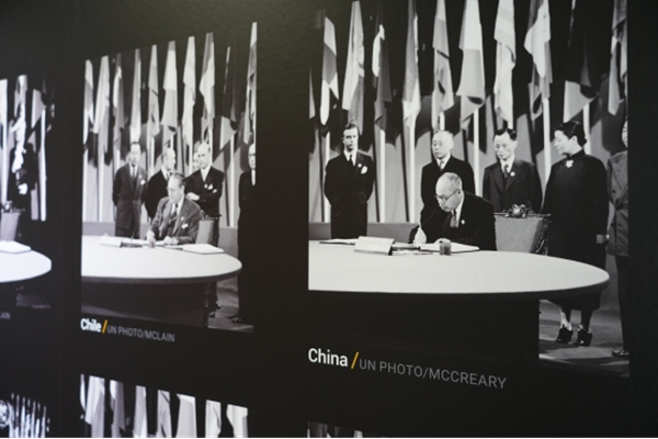 2025年6月26日,旨在纪念《联合国宪章》签署80周年的展览《重振旧金山精神》在纽约联合国总部举行,展览通过影像和实物呈现80年前《联合国宪章》在旧金山联合国国际组织会议上签署通过的历史。图为展览展示中国代表董必武在《联合国宪章》上签字的历史图片(右图)