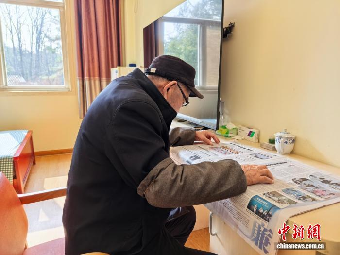 一位长者闲时在养老机构内看报。张煜欢 摄