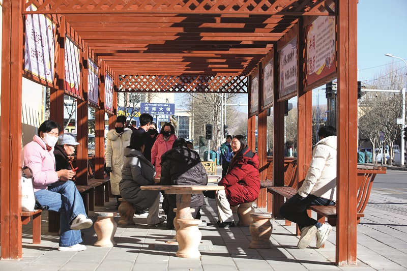 三角城社区民族团结文化长廊聚集着来此休闲娱乐的社区居民