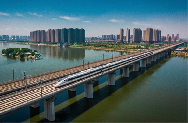 2018年6月10日,陕西西安,一列高铁动车在灞河特大桥上快速通过