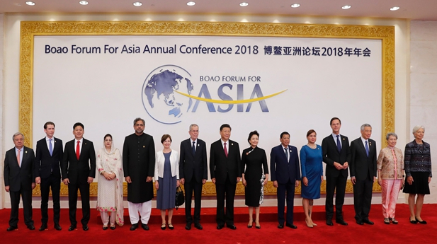 2018年4月10日,中国国家主席习近平在海南博鳌出席博鳌亚洲论坛2018年年会开幕式并发表题为《开放共创繁荣 创新引领未来》的主旨演讲。图为开幕式前,习近平和夫人彭丽媛前往迎宾厅迎接外方领导人夫妇并集体合影