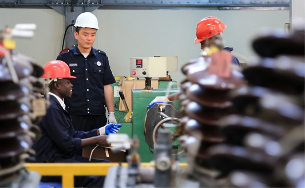 2016年10月5日,在肯尼亚内罗毕的友盛集团变压器工厂,一名中国工程师指导肯尼亚员工作业