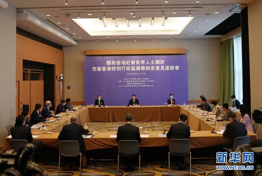听取香港各界完善选举制度意见座谈会现场(3月15日摄)。新华社记者 李钢 摄