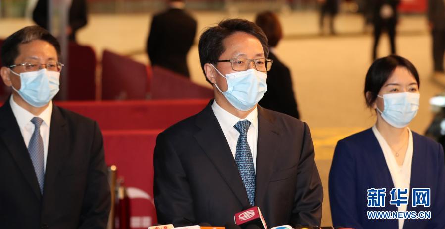 3月17日,国务院港澳办分管日常工作的副主任张晓明(中)会见传媒。新华社记者 李钢 摄