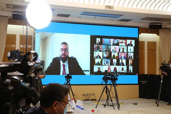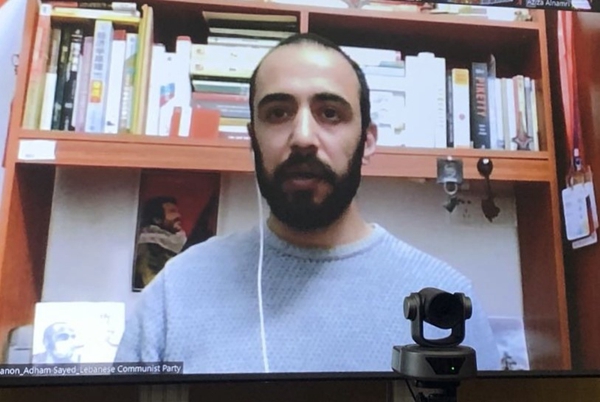 3月30日,黎巴嫩共产党中央委员阿德汉·赛义德在中阿青年政治家论坛开幕式后通过视频连线的方式接受记者集体采访。摄影:张辉