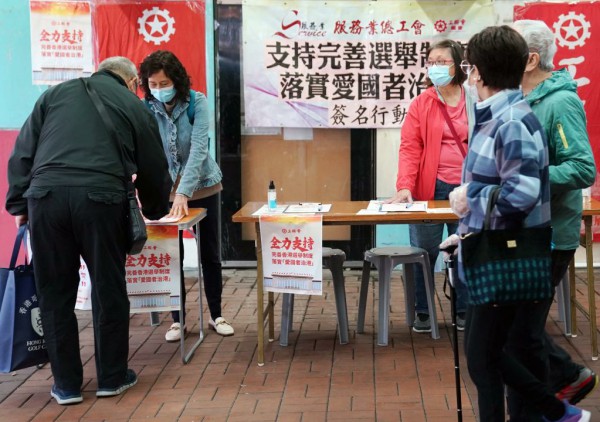 3月7日,在香港铜锣湾鹅颈桥下,香港市民签名支持完善香港选举制度,落实“爱国者治港”。新华社记者李钢摄