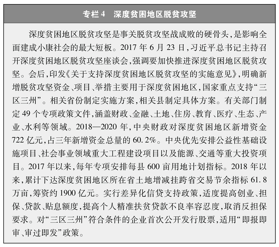 深度贫困地区是贫中之贫、坚中之坚。通过脱贫攻坚,“三区三州”⑨等深度贫困地区突出问题得到根本解决,基础设施和公共服务水平显著提升,特色主导产业加快发展,社会文明程度明显提高,区域性整体贫困问题彻底解决(专栏4)。