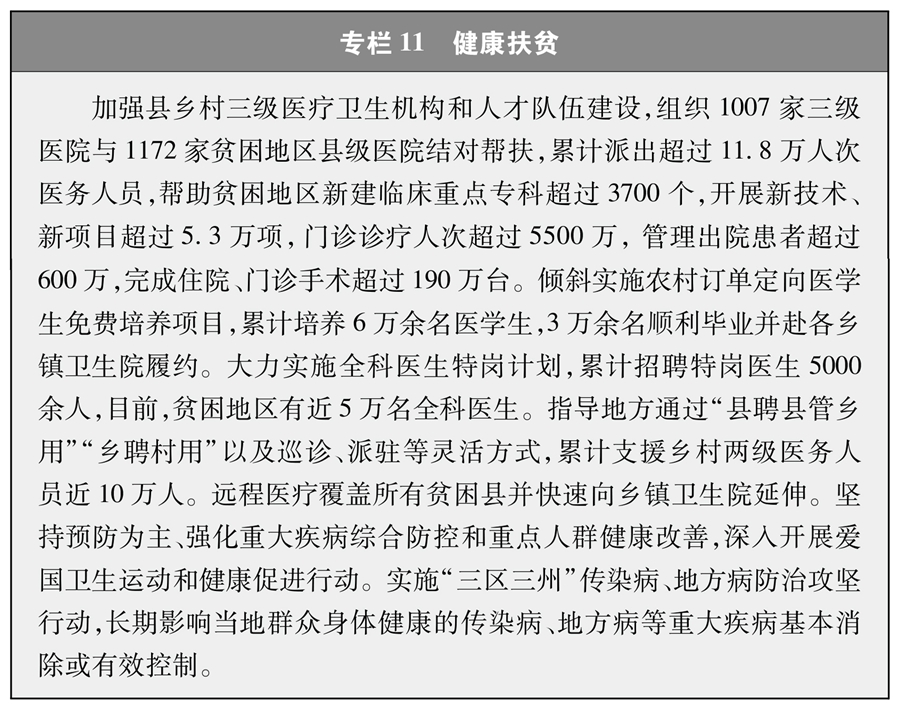 “两不愁三保障”全面实现。脱贫攻坚普查⑧显示,贫困户全面实现不愁吃、不愁穿,平时吃得饱且能适当吃好,一年四季都有应季的换洗衣物和御寒被褥。贫困人口受教育的机会显著增多、水平持续提高,农村贫困家庭子女义务教育阶段辍学问题实现动态清零,2020年贫困县九年义务教育巩固率达到94.8%。持续完善县乡村三级医疗卫生服务体系,把贫困人口全部纳入基本医疗保险、大病保险、医疗救助三重制度保障范围,实施大病集中救治、慢病签约管理、重病兜底保障等措施,99.9%以上的贫困人口参加基本医疗保险,全面实现贫困人口看病有地方、有医生、有医疗保险制度保障,看病难、看病贵问题有效解决。实施农村危房改造,贫困人口全面实现住房安全有保障(专栏1)。实施农村饮水安全和巩固提升工程,累计解决2889万贫困人口的饮水安全问题,饮用水量和水质全部达标,3.82亿农村人口受益;贫困地区自来水普及率从2015年的70%提高到2020年的83%。