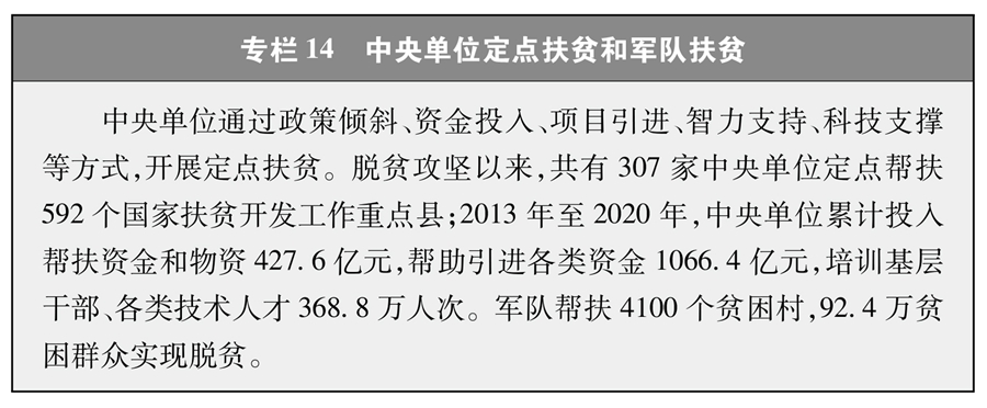 扶贫减贫是艰巨复杂的系统工程,需要调动各方积极参与。为打赢脱贫攻坚战,中国共产党依托严密组织体系和高效运行机制,广泛有效动员和凝聚各方力量,构建政府、社会、市场协同推进,专项扶贫、行业扶贫、社会扶贫互为补充的大扶贫格局,形成跨地区、跨部门、跨单位、全社会共同参与的多元主体的社会扶贫体系。加强东西部扶贫协作和对口支援(专栏13),推动省市县各层面帮扶,促进人才、资金、技术向贫困地区流动,实现优势互补,缩小区域差距。积极开展定点扶贫,组织各级党政机关、人民团体、国有企事业单位和军队帮扶贫困县或贫困村(专栏14)。各民主党派、工商联和无党派人士充分发挥各自优势,为打赢脱贫攻坚战献智献力。积极推动各行各业发挥专业优势,开展产业扶贫、科技扶贫、教育扶贫、文化扶贫、健康扶贫、消费扶贫。广泛动员民营企业参与扶贫开发,引导市场开发能力强的主体进入资源开发潜力大的地区,实现互惠互利、共同发展(专栏15)。广泛动员社会组织、公民个人积极参与脱贫攻坚,开展扶贫公益活动。设立国家扶贫日,建立脱贫攻坚国家荣誉制度,表彰脱贫攻坚先进典型,营造了人人愿为、人人可为、人人能为的社会帮扶氛围。