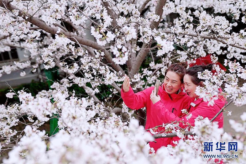 3月13日武汉大学抗疫医护人员赏樱专场启动,来自全国各地的援鄂抗疫英雄在樱花树下重逢。新华社记者熊琦 摄