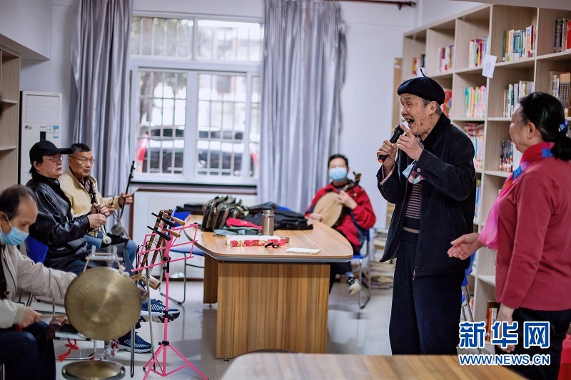 3月31日,居民在武汉东湖新城社区活动室唱楚剧。新华社记者肖艺九 摄