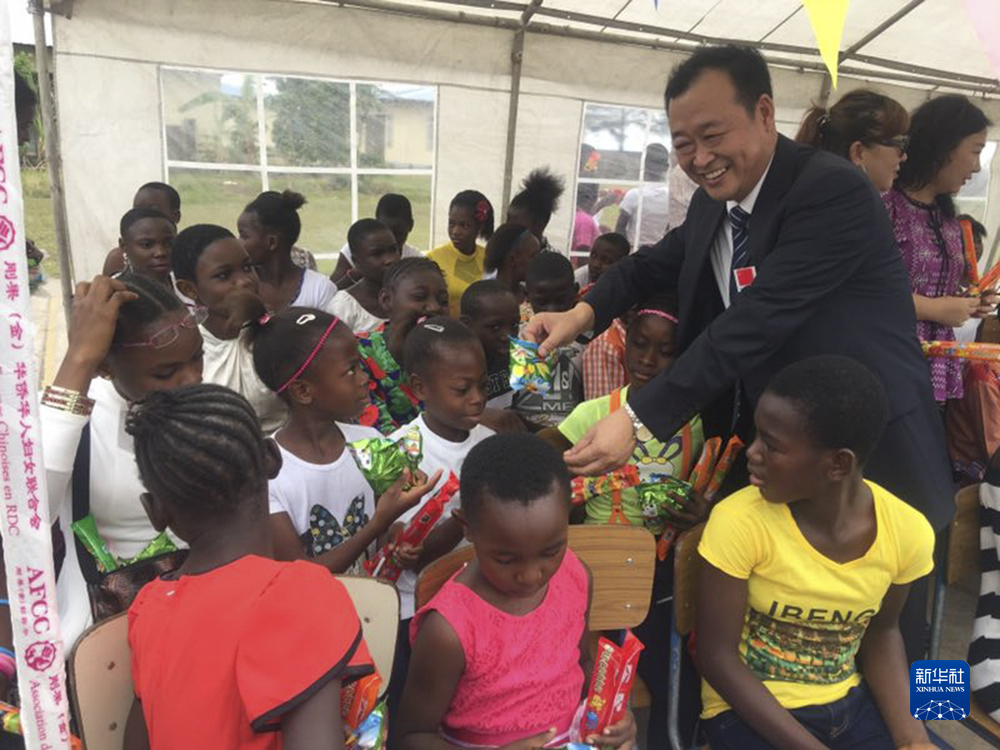 2017年10月1日,中国第17批援刚果(金)医疗队队长王俊辉带领队员来到刚果(金)国际SOS儿童村,给孩子们分发食品和礼物,并开展儿童义诊。新华社