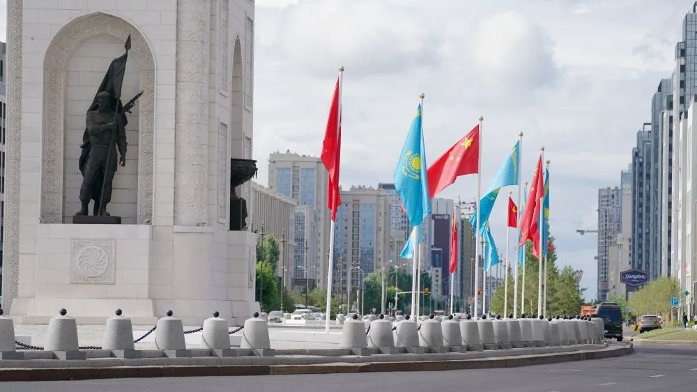7月2日,欢迎旗帜飘扬在哈萨克斯坦首都阿斯塔纳街头。新华社供图