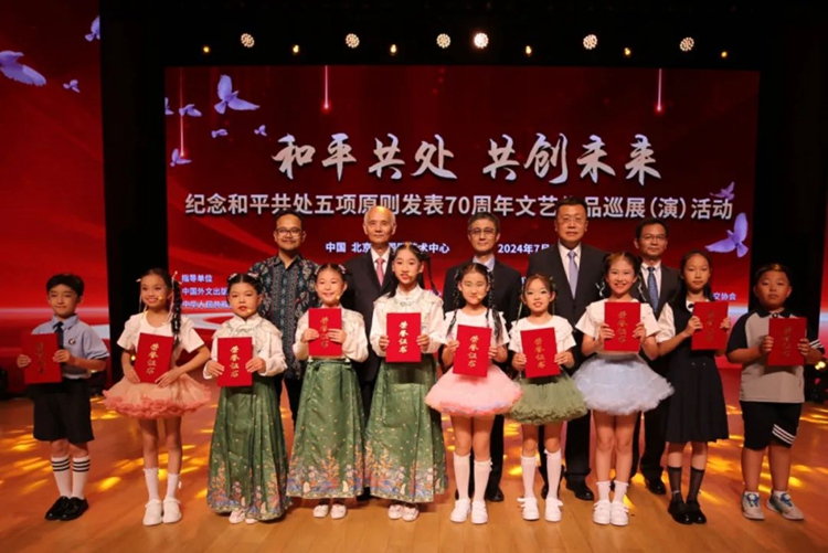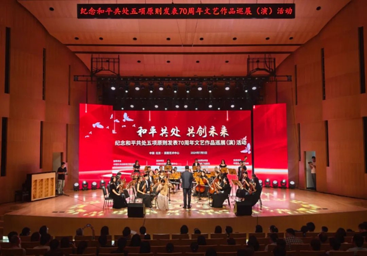 7月5日,由中国外文局、外交部亚洲司指导,中国外文局亚太传播中心主办,中国公共外交协会支持的“纪念和平共处五项原则发表70周年文艺作品巡展(演)活动”在北京启动。中国外文局总编辑高岸明、中国公共外交协会副会长罗林泉、外交部亚洲司参赞邓伟、中国—东盟中心文化教育旅游部主任贺迪、印尼驻华大使馆文化教育参赞李健、希杰集团中国区副总裁刘常仁等嘉宾以及来自相关部委、驻华使馆、高校及文艺专业组织机构、媒体等近千名人士出席活动并共同观看展演。