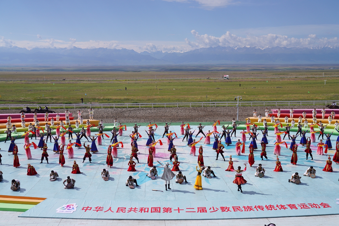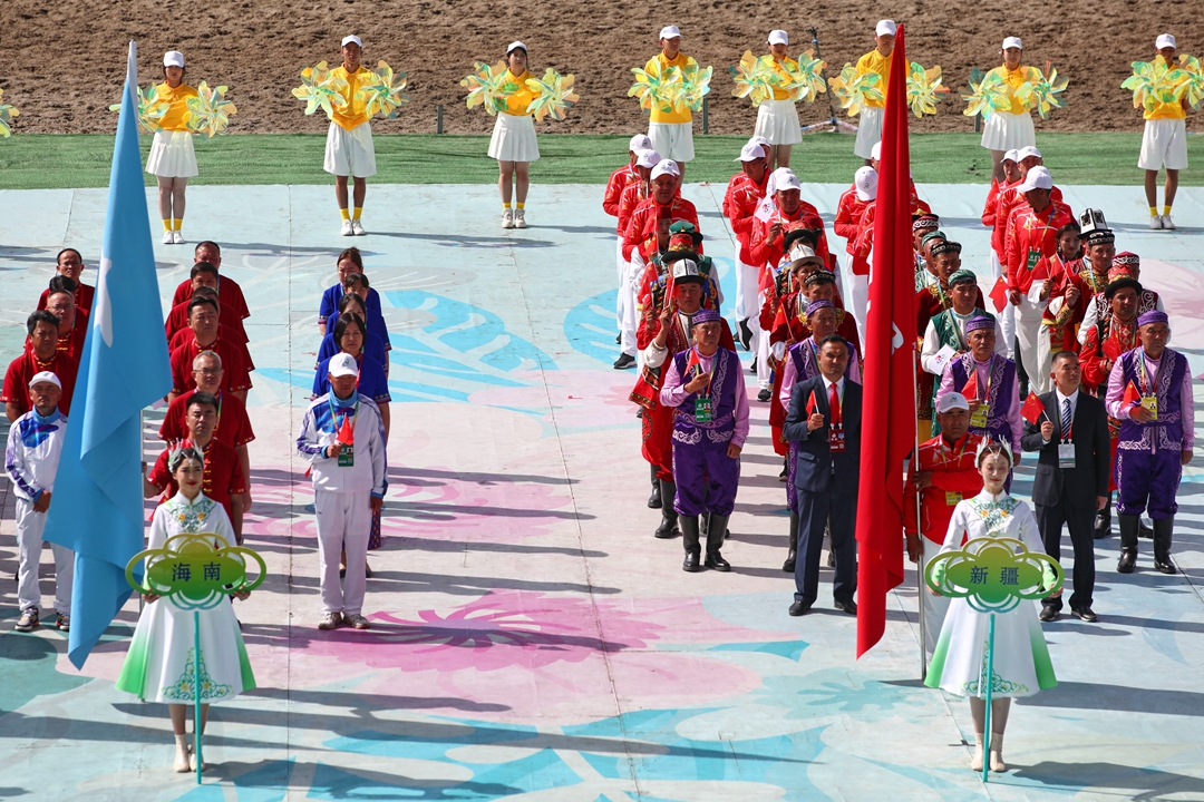7月8日上午,第十二届全国少数民族传统体育运动会马上项目在伊犁哈萨克自治州昭苏县开赛。在开赛仪式上,中华人民共和国国旗和运动会会旗、本届运动会会徽旗方队、12支代表队依次入场。全场起立,在高唱中华人民共和国国歌的歌声中,五星红旗冉冉升起;伴随着全国少数民族传统体育运动会会歌《爱我中华》,运动会会旗、本届运动会会徽旗徐徐升起。