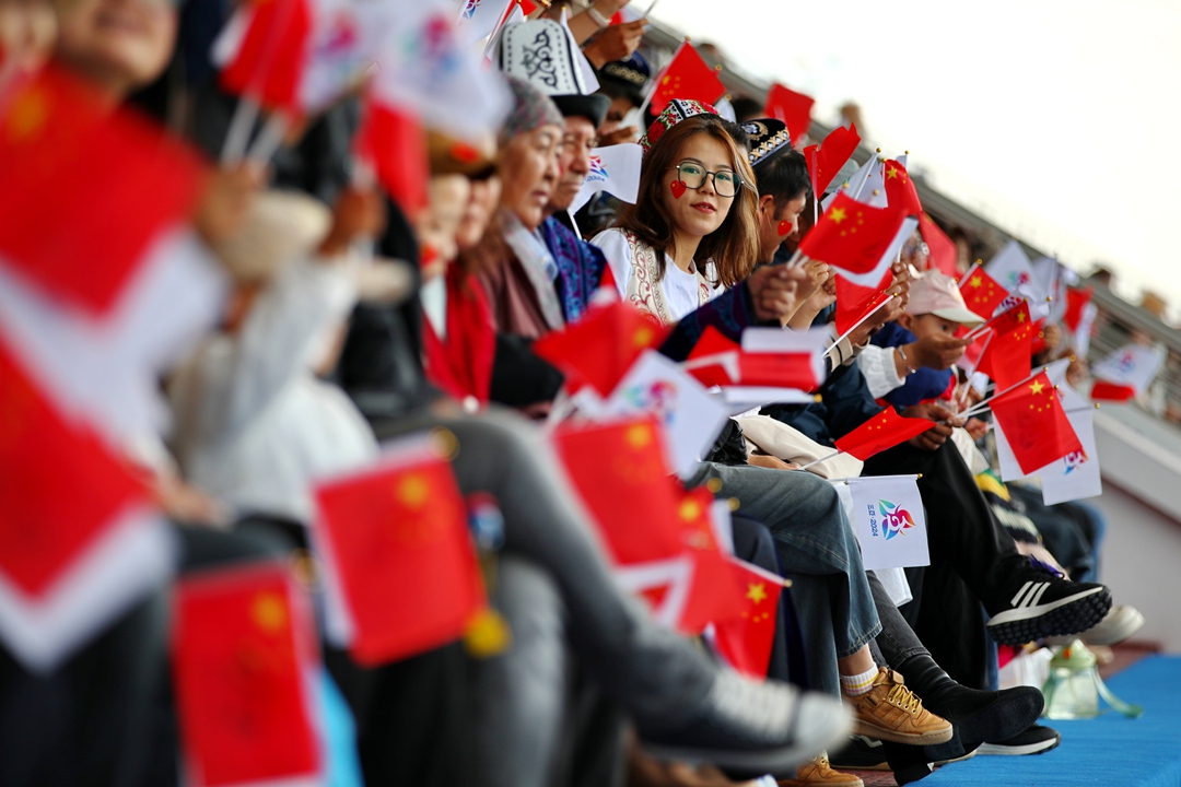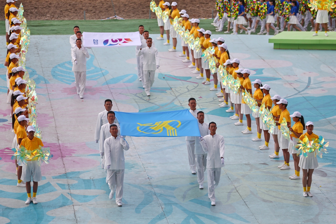 开赛仪式以“石榴花盛开 筑梦新时代”为主题进行文艺表演,“幸福欢歌”、“丝路长歌”、“追梦放歌”再现各民族交往交流交融的历史画卷,展示中华民族团结奋进、共建美好家园的时代风貌。万马奔腾的景象,欢快的歌舞,辽阔的草原,巍峨的天山,交汇成一幅壮丽美景。最后,全场起立高唱《歌唱祖国》,祝福伟大祖国繁荣昌盛、国泰民安。