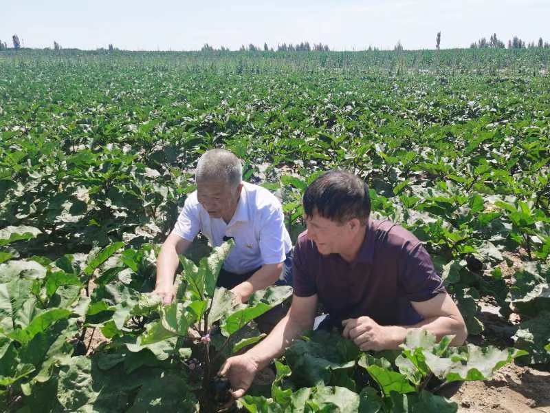 彭昌金与阿不力克木·买提尼亚子在田间查看茄子的生长情况