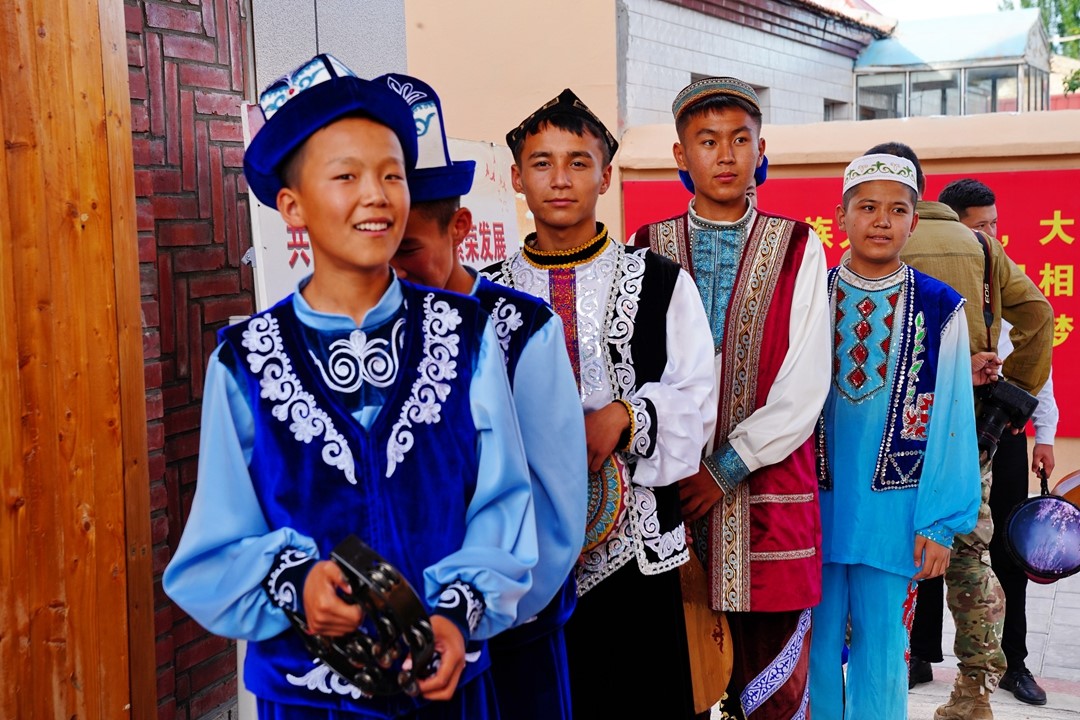 身着各民族传统服饰的少年们在沈“阿塔”家欢聚一堂