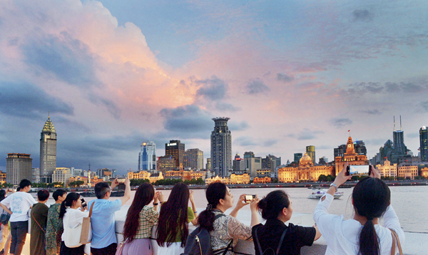 2023年7月18日,上海,盛夏夜里,“一江一河”滨水公共空间成了沪上市民游客消暑纳凉的好去处,滨江大道上空现瑰丽晚霞