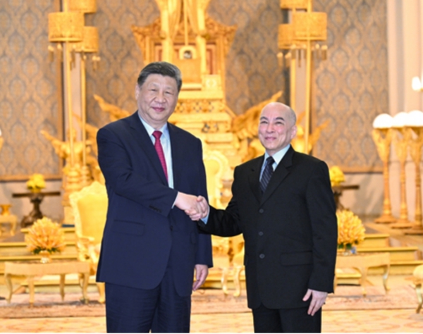 Chinese President Xi Jinping meets with Cambodian King Norodom Sihamoni at the Royal Palace in Phnom Penh, Cambodia, on April 17, 2025. (XINHUA)