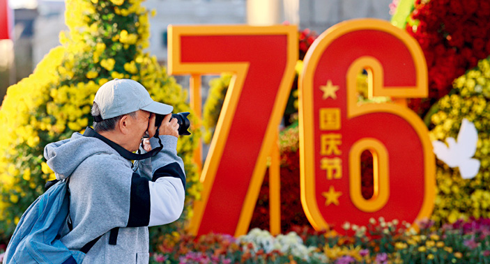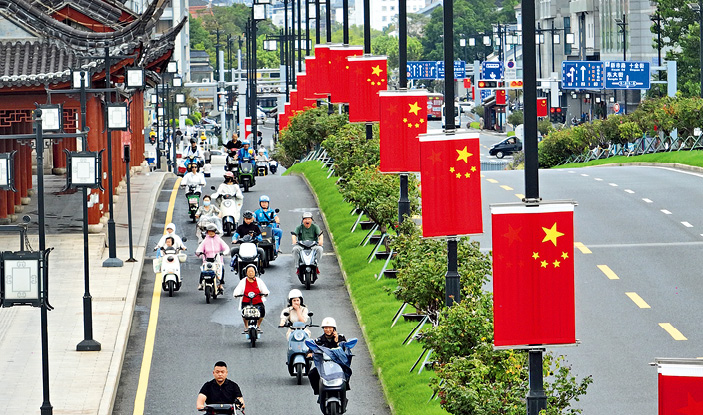 北京天安门广场展出“祝福祖国”巨型花篮,主景顶高18米,首次应用北京市花月季作为焦点花,并布置了会发光的鸽子造型。广场两侧绿地还布置了吉祥如意花带,18个花球点缀其中,总面积达9600平方米。在重庆渝中区及山西太原的主要街道两旁,整齐悬挂的国旗成为亮眼风景。江苏苏州、无锡、扬州等地也布置了国旗和花卉,不仅为城市增添了浓厚的节日氛围,更点燃了市民心中炽热的爱国情怀。