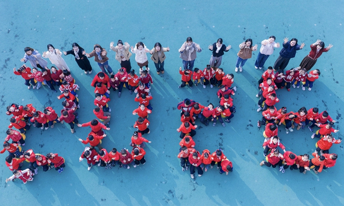 2025年12月30日,江苏省昆山市,幼儿园的小朋友们和老师们在操场上摆出“2026”的造型迎接元旦的到来