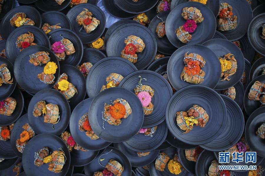 10月2日在江苏淮安洪泽区举行的“千人品螃蟹”活动上拍摄的烹饪好的螃蟹。 新华社发(万震 摄)