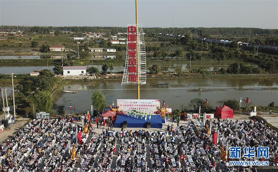10月2日在江苏淮安洪泽区拍摄的“千人品螃蟹”活动现场(无人机拍摄)。 新华社发(万震 摄)