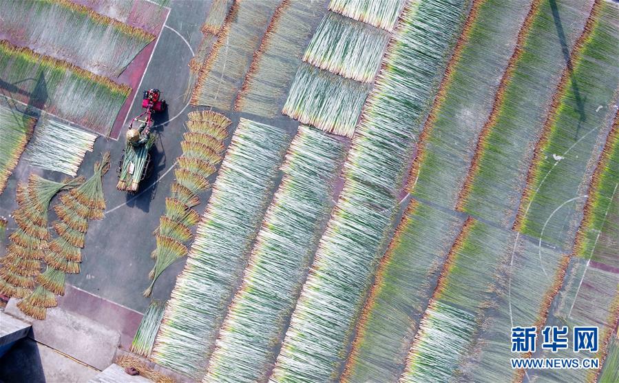 10月7日,六羊屯村民在晾晒蔺草(无人机拍摄)。金秋时节,广西柳州市柳江区百朋镇里团村六羊屯种植的200多亩蔺草迎来丰收,农民抓住晴好天气集中收割、晾晒。据了解,六羊屯农户将晾晒后的蔺草编织成壮族草席,每亩产值近3万元,成为农民脱贫致富的主导产业。新华社发(黎寒池 摄)