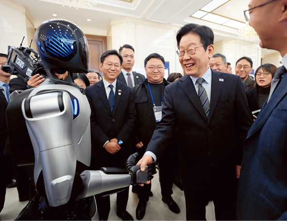 2025年1月7日,上海市,韩国总统李在明出席中韩创新创业论坛,并与中国智元人形机器人握手,了解人形机器人产业发展现状