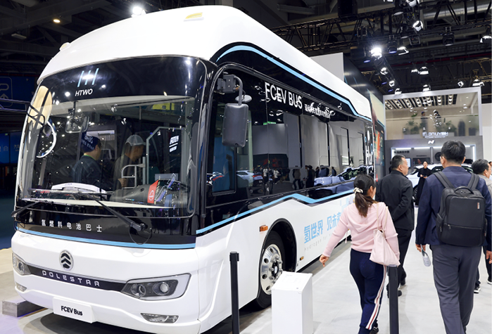 2024年11月6日,上海市,第七届中国国际进口博览会上,现代汽车氢燃料电池驱动的氢燃料电池巴士亮相展区