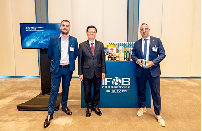 2025年6月24日,在香港特区政府投资推广署举办的国际及内地企业落户香港欢迎会上,香港特区行政长官李家超(中)参观了意大利食品进口及分销商Bright View Trading公司展台
